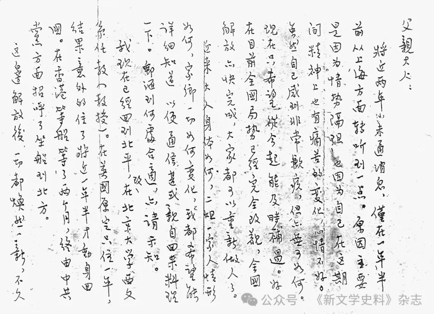 將近兩年,未通消息,僅在一年半前從上海方面轉(zhuǎn)聽到一點,原因主要是因為情勢隔阻,也因為自己在這期間精神上也有痛苦的變化,心情不好。雖然自己感到非常歉疚,但亦無可如何?,F(xiàn)在只希望從今起能及時補過。好在目前全國局勢已經(jīng)完全改觀,全國解放亦快完成,大家都可以重新做人了。
