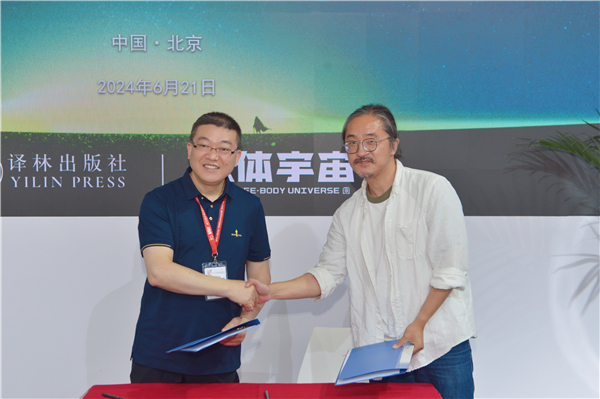 6月21日上午,《三體》圖像小說合作簽約儀式在北京圖博會(huì)江蘇展區(qū)舉行,標(biāo)志著《三體》圖像小說簡體字版權(quán)花落譯林出版社。江蘇鳳凰出版?zhèn)髅焦煞萦邢薰靖笨偨?jīng)理袁楠、三體宇宙內(nèi)容中心負(fù)責(zé)人季煒銘、譯林出版社社長葛慶文、漫畫家吳青松、西班牙漢學(xué)家夏海明等出席簽約儀式。儀式由譯林出版社副總編輯陸志宙主持。