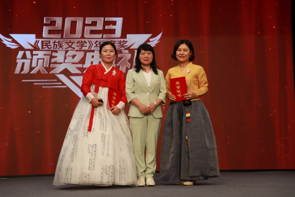 楊玉梅為《民族文學(xué)》朝鮮文版獲獎(jiǎng)作家翻譯家李順花、金海鷹頒獎(jiǎng)