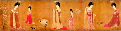 五代時(shí)期的仕女圖,在表現(xiàn)技法上基本承繼了前朝的風(fēng)格余緒。如阮郜的《閬苑女仙圖》中,人物清瘦寡淡,體態(tài)修長(zhǎng),有幾分顧愷之筆下洛神的風(fēng)韻。筆墨技法尚存唐風(fēng)遺韻,人物衣紋細(xì)密,雙勾填色,色調(diào)絢麗卻又不失古雅清幽的意境。同樣,傳為南唐畫家周文矩所作《合樂圖》,也有著顯著的唐代風(fēng)韻,尤其是人物造型圓潤(rùn)飽滿,只是線條較為方折,不似唐畫用線的悠長(zhǎng)綿密。