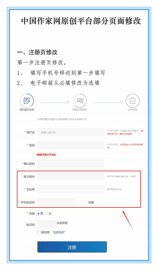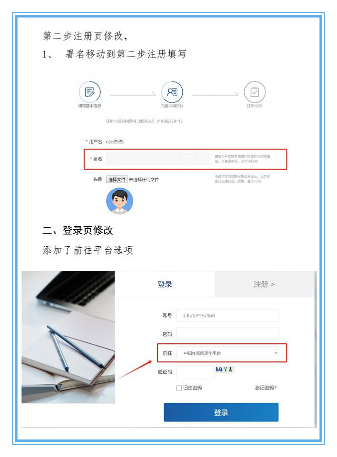 我們將于7月22日上線(xiàn)中國(guó)作協(xié)會(huì)員注冊(cè)系統(tǒng),屆時(shí)原創(chuàng)平臺(tái)注冊(cè)和登錄頁(yè)面信息顯示會(huì)發(fā)生個(gè)別變化,但對(duì)注冊(cè)及登錄使用不發(fā)生影響。我們以圖片示例形式(見(jiàn)下圖一、二、三、四)將頁(yè)面變化公告如下,請(qǐng)知悉。
