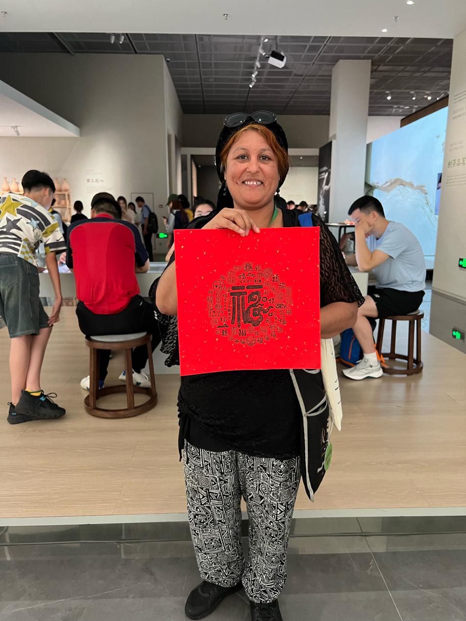 在浙江省非遺館,詩(shī)人們觀摩了西湖龍井的制作過(guò)程。沙特詩(shī)人胡達(dá)·穆巴拉克是一位中國(guó)茶愛(ài)好者,對(duì)前一天在晚宴上喝到的西湖龍井十分喜愛(ài),親眼看到西湖龍井的炒制過(guò)程讓她非常興奮,制茶師父抓了一把熱乎的龍井示意胡達(dá)聞一聞,感受茶葉的香氣,“太美妙了!” 胡達(dá)贊嘆。南非詩(shī)人蓋蕾婭·弗雷德里克斯則向記者展示了她在體驗(yàn)雕版印刷技藝時(shí)所完成的作品——紅色的紙上印滿了大大小小字體各異的“?!?,“他們說(shuō)這代表著許多的好運(yùn)!” 蓋蕾婭對(duì)親手制作的福字帖非常滿意。