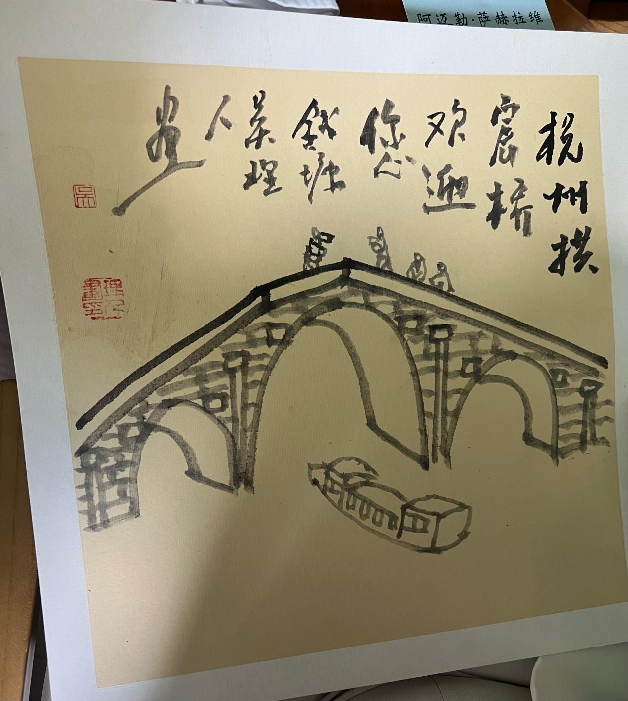 在大運(yùn)河博物館,阿聯(lián)酋詩(shī)人阿邁勒·薩赫拉維被一位正在描繪運(yùn)河的畫家吸引,停下了參觀的腳步。吳理人是杭州人,他筆下的運(yùn)河不僅是風(fēng)景,同時(shí)飽含深情與記憶,他的畫作打動(dòng)了阿邁勒。她拿起筆,畫下了象征著京杭大運(yùn)河到杭州的終點(diǎn)標(biāo)志——拱宸橋,吳理人也同時(shí)畫下心中的拱宸橋,兩人互贈(zèng)畫作。此時(shí),拱宸橋就是聯(lián)結(jié)兩國(guó)的友誼之橋。