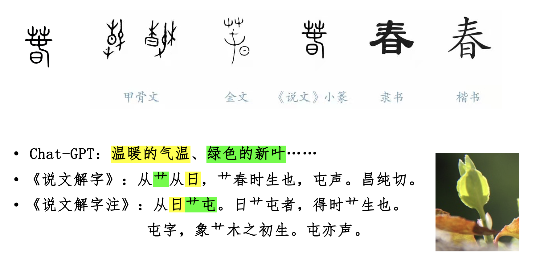 我們將古人的解讀與Chat-GPT 的回答相對(duì)照:“日”對(duì)應(yīng)于Chat-GPT所說的“溫暖的氣溫”,“艸”和“屯”對(duì)應(yīng)于“綠色的新葉”(見圖一高亮色塊的對(duì)應(yīng)關(guān)系)。在“春”的甲骨文字形里,“艸”分解成了兩個(gè)“屮”,而“屯”幾乎就是植物萌芽(圖一右下方)的擬態(tài)。不難發(fā)現(xiàn),我們的祖先和AI大模型,雖然被漫長的歷史和海量的網(wǎng)絡(luò)數(shù)據(jù)分隔在兩端,但在描述春天這件事情上是不謀而合的,這很浪漫,又很科學(xué)。在這個(gè)案例里,AI主要扮演了類似于“智能助教”或“賽博對(duì)談?wù)摺钡慕巧?/p>