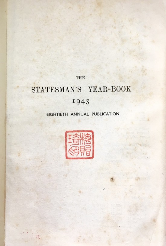 2024年4月,我買(mǎi)到一冊(cè)殘破的英文舊書(shū)《1943年度政治家年鑒》(The Statesman's Year-book 1943),書(shū)名頁(yè)鈐朱文篆印“梅貽琦印”?!墩渭夷觇b》是英國(guó)歷史最悠久的政經(jīng)年鑒,始創(chuàng)于1864年,到今天仍在持續(xù)出版。1943年度的,為該年鑒第八十次刊行?!墩渭夷觇b》一般在當(dāng)年年初面世,而所載信息更新相當(dāng)及時(shí),如《1943年度政治家年鑒》有關(guān)中國(guó)部分,當(dāng)時(shí)國(guó)民政府的部長(zhǎng)名單,更新至1942年12月7日。全書(shū)厚達(dá)一千四百多頁(yè),能維持這樣的更新速度,編纂能力是驚人的。這樣一部工具書(shū),當(dāng)然是供人查閱,而非展讀的。不過(guò),梅貽琦既鄭重鈐印,自己留存,想來(lái)還是覺(jué)得它有用處。梅貽寶回憶,1945年赴美前曾到昆明看望兄長(zhǎng)梅貽琦(按“大排行”,稱(chēng)為“五哥”),在兄嫂家住了一夜:“臨睡前給我搭了張行軍床,借了條被,就設(shè)在五哥書(shū)架前……”(《5月19憶“五哥”》,收入《天南地北坐春風(fēng):家人眼中的梅貽琦》,石油工業(yè)出版社2018年9月版,72頁(yè))梅貽琦家中有書(shū)架,證明藏書(shū)多少總會(huì)有一些,或許這冊(cè)《1943年度政治家年鑒》即在架上,也未可知。