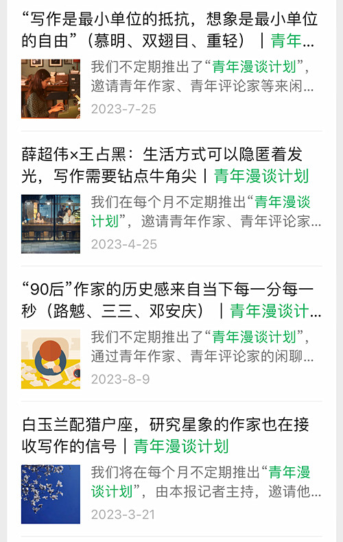 過去的前輩作家們,喜歡將自己隱藏在作品之后,保持某種神秘感。如今青年作家的涌現(xiàn)讓我們看到了更多寫作者身上的幻彩人生,他們不再遮掩自己的偏好,他們樂于表達(dá)自己的觀察,他們愿意打開自己聯(lián)結(jié)更多的人?;蛟S他們的寫作依然還在起點,仍在勃發(fā),但我們從這兩個欄目中,讓讀者看到了真誠可感的“同代作家”。當(dāng)有讀者表示自己因為這些文字被理解、被共情時,我想,這就是誕生意義的閃光處,也是我們繼續(xù)與之同行的美好動力。