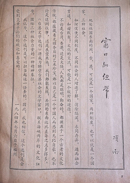 永遠銘記于心的是,1984年7月6日,時任福建省委書記項南為《臺港文學選刊》撰寫了代發(fā)刊詞《窗口和紐帶》,言簡意賅地闡明了《臺港文學選刊》的性質(zhì)、意義和作用。他指出:“如何促使不同制度、不同社會的人增進了解,消除隔閡,求同存異,進而融會貫通,和諧默契?文化的交流,可能是一個較好的途徑?!彼诖?,“《臺港文學選刊》將成為瞭望臺港社會的文學窗口,聯(lián)系海峽兩岸的文化紐帶,團結(jié)三種社會力量的一種精神象征”,“這個選刊是可以擔當起這一任務(wù)的。因此,我也相信,這個選刊是會受到炎黃子孫們的歡迎和喜愛的”。