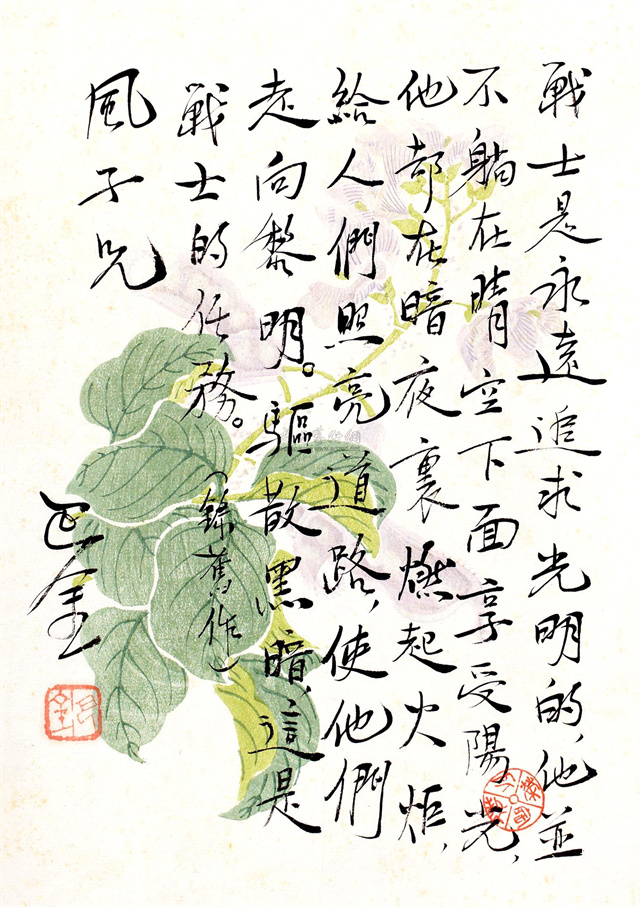 巴金手札,內(nèi)容是“戰(zhàn)士是永遠(yuǎn)追求光明的,他并不躺在晴空下面享受陽(yáng)光,他卻在暗夜里燃起火炬,給人們照亮道路,使他們走向黎明。驅(qū)散黑暗,這是戰(zhàn)士的任務(wù)。”