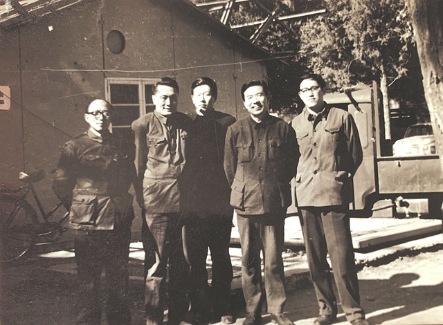 在《文藝報》簡易樓前。左起為鄭興萬、謝永旺、寒小風(fēng)、唐達成、高洪波