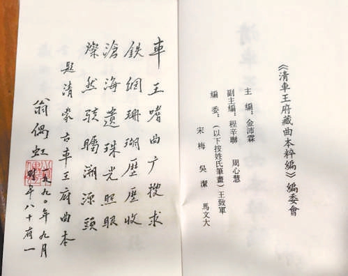 翁偶虹先生家里我們也去過(guò)多次,每次拿著大摞的《曲本》去請(qǐng)教,哪些是高腔唱本,哪些是昆曲唱本。很多戲曲唱本中既有京腔,也有高腔,有的還有昆曲曲牌,朱家溍先生將之定義為清中晚期出現(xiàn)的“昆亂不擋”時(shí)期的“亂彈”。我們決定遵循朱老的建議,不用京劇的名稱,改稱此類為“亂彈”,以反映京劇在北京的發(fā)展與演變過(guò)程。書即將出版的時(shí)候,我們請(qǐng)翁偶虹先生題詞,翁先生欣然作詩(shī)一首:“車王嗜曲廣搜求,鐵網(wǎng)珊瑚歷歷收。滄海遺珠光照眼,燦然駭囑溯源頭。”