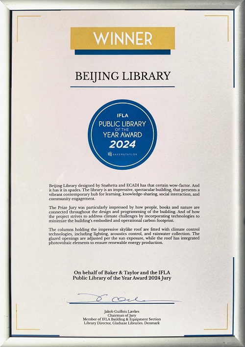 北京城市圖書館榮獲國際圖聯(lián)2024年度公共圖書館獎(jiǎng)
