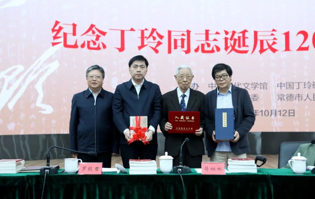 座談會現(xiàn)場還舉行了丁玲手稿展和圖書捐贈儀式。現(xiàn)場展出了丁玲人生不同階段的代表性照片,以及《建設(shè)新中國之文藝工作》《魯迅先生于我》《我所認(rèn)識的瞿秋白同志》等珍貴手稿。蔣祖林、中國社科院文學(xué)所學(xué)者何吉賢、河北教育出版社黨委書記董素山共同向中國現(xiàn)代文學(xué)館捐贈了《丁玲作品精選集》,中國現(xiàn)代文學(xué)館常務(wù)副館長王軍接受捐贈并回贈入藏證書。