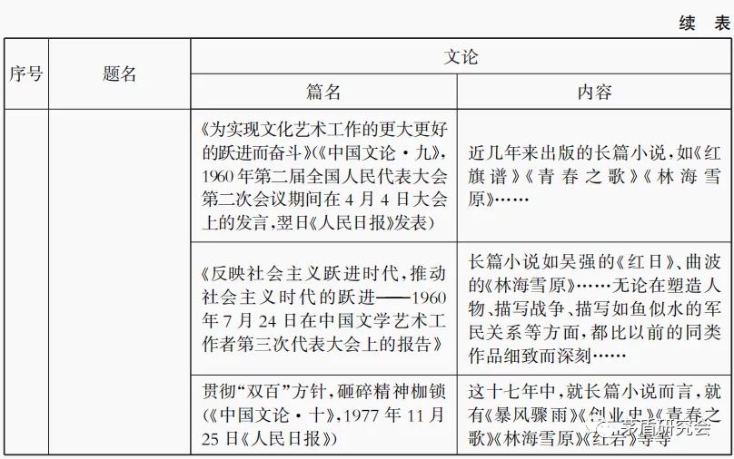 由表4可知,關于《紅巖》的提及是最少的,梁斌《紅旗譜》則較為頻繁,在一次報告中三次提及,關于曲波《林海雪原》提及時間跨度最長,最早在1958的《談青年業(yè)余創(chuàng)作——在沈陽市青年業(yè)余作者大會上的講話》(《中國文論·八》,1958年《文學青年》第七期),最晚為1977年的《貫徹“雙百”方針,砸碎精神枷鎖》(《中國文論·十》,1977年11月25日《人民日報》)。