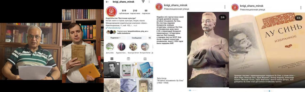 海外讀者反饋部分照片,其中左二是俄羅斯?jié)h學家羅季奧諾夫展示的1929年出版的俄文版魯迅作品,右二是白俄羅斯藝術家扎伊爾·阿茲古爾制作的魯迅雕像