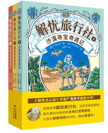 這是一套富有想象力的奇幻冒險(xiǎn)故事書。生活中遇到煩惱的主人公,會(huì)由“解憂旅行社”安排,在貓頭鷹的帶領(lǐng)下,踏上不可思議的冒險(xiǎn)之旅來解除煩憂,并在旅程中得到鍛煉與成長(zhǎng),體會(huì)到勇敢承擔(dān)責(zé)任、理解他人、相互幫助的重要性?!渡衬畬毱嬗鲇洝罚捍笪蛎懊笆Ш裙饬吮驹撊乙黄鸷鹊恼滟F果汁。為了重現(xiàn)果汁,解憂旅行社安排他去沙漠王國(guó)尋找水果。他投靠了販鹽的駱駝商隊(duì),每天發(fā)揮所長(zhǎng),做飯換取食物和水。機(jī)緣巧合之下,他認(rèn)識(shí)了藏于民間的夏爾丹王子,并卷入了巨大的危險(xiǎn)之中……《魔獸牧場(chǎng)冒險(xiǎn)記》:陸斗不小心打碎了媽媽的精靈擺件,他不敢承擔(dān)責(zé)任,甚至想要“離家出走”。解憂旅行社安排他去魔獸牧場(chǎng)寄宿。他天生熱愛動(dòng)物,每天照顧各種各樣稀奇的魔獸,很累但也很高興,直到他在貓頭鷹向?qū)У募⑾?,打開了塞壬小屋的門……《龍神爭(zhēng)奪對(duì)戰(zhàn)記》:拓真和伸介是很好的朋友,他們一個(gè)性子急,擅長(zhǎng)運(yùn)動(dòng);一個(gè)性子慢,擅長(zhǎng)手工。有一天,兩人吵了架,都想讓對(duì)方先給自己道歉。解憂旅行社安排他們?nèi)ゴ湫巧絽⒓育埳窆?jié),去幫助所在的村子獲得龍神的幫助,還給他們安排了一對(duì)同樣性格迥異的雙胞胎貓頭鷹當(dāng)向?qū)?。究竟誰(shuí)會(huì)獲勝呢……