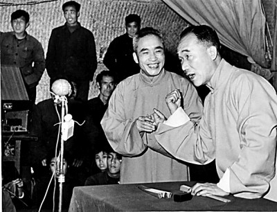 新中國成立后,相聲界對(duì)舊相聲進(jìn)行了凈化語言、提升格調(diào)的革新整理。圖為侯寶林和郭全寶演出新相聲。圖片由中國曲協(xié)提供