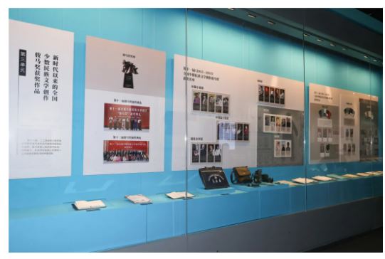 第三展區(qū)聚焦新時(shí)代以來黨中央對(duì)民族工作的高度重視和民族文學(xué)事業(yè)的繁榮。新時(shí)代新征程,民族文學(xué)人才輩出,優(yōu)秀作品大量涌現(xiàn)。