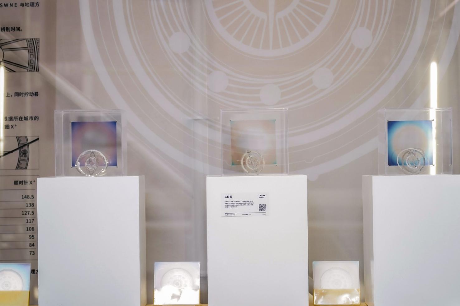 繞至欄板背后,三種不同色調(diào)下的鋼制日晷在光線(xiàn)中舒展擺放,吸引了許多觀(guān)展者駐足。這款名為《三日晷》的擺件是ALINE的三周年特別之作。輕巧的日晷上刻畫(huà)著十二地支,輕輕旋轉(zhuǎn)內(nèi)環(huán),即可調(diào)節(jié)時(shí)間置于桌面,無(wú)需借助其他機(jī)械裝置。《三日晷》共分為曉色、霞色、宙色三款,合起為書(shū)簽,展開(kāi)為日晷,于光影中流轉(zhuǎn)時(shí)間的印記。