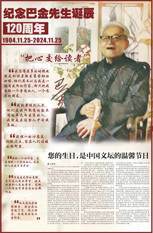 在巴金故居、巴金書房、巴金圖書館,在巴金學術(shù)研討會、青年作家座談會,在地鐵的文化長廊,我們在上海不同的場域,以不同的方式,共同紀念人民作家巴金的120周年誕辰。感謝先生留給我們一種與時代同行的精神探索,一種直面現(xiàn)實的思想狀態(tài),一種青春在場的生命熱能,一種與人民同心的文學魅力。他對世界深沉的愛與思索,讓我們在砥礪前行中倍感鼓舞與溫暖。