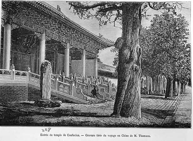 一位攝影師,對(duì)中國(guó)儒家思想與封建時(shí)期官員選拔制度能有如此了解與見(jiàn)地,是我未曾想到的。其實(shí)早在16世紀(jì)末,來(lái)華的基督教耶穌會(huì)傳教士在中國(guó)老師們的幫助下,從學(xué)習(xí)中文開(kāi)始,逐步進(jìn)入到翻譯中國(guó)傳統(tǒng)典籍的工作中,并系統(tǒng)地制定了西書(shū)漢譯和漢書(shū)西譯的計(jì)劃。因此,“四書(shū)五經(jīng)”為代表的儒家典籍不斷以不同語(yǔ)言譯本的形式出現(xiàn)在歐洲,并隨著歐洲移民的步伐來(lái)到北美大陸。17至19世紀(jì),隨著翻譯、研究成果的不斷豐富,儒家典籍的影響從宗教領(lǐng)域延伸到哲學(xué)、思想和文化領(lǐng)域,傳播對(duì)象也從傳教士擴(kuò)散到漢學(xué)家與社會(huì)、文化精英,引發(fā)歐美精英階層對(duì)中國(guó)儒家文化的濃厚興趣。在這種長(zhǎng)期鋪墊下,以孔廟為視覺(jué)重心這一思路,或許在湯姆遜來(lái)華之前便已奠定。
