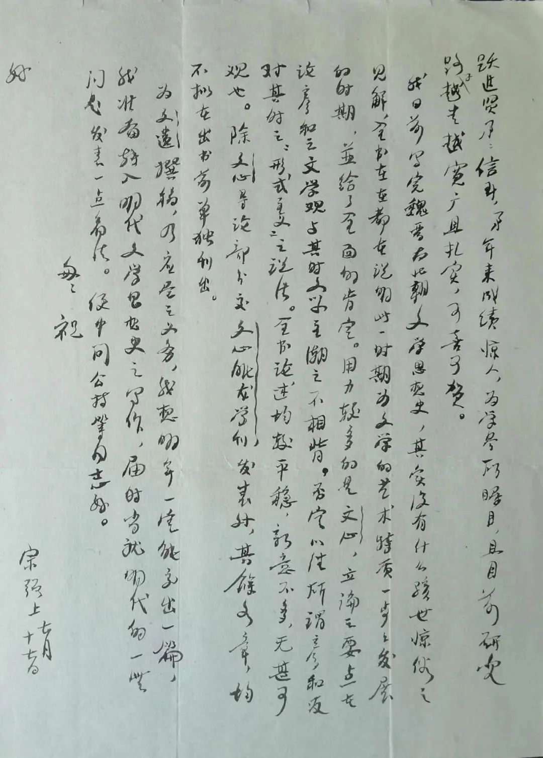 躍進賢弟:信到。弟年來成績驚人,為學界所矚目,且目前研究路子越走越寬廣且扎實,可喜可賀。我日前寫完《魏晉南北朝文學思想史》,其實沒有什么駭世驚俗之見解,全書都在說明此一時期為文學的藝術(shù)特質(zhì)一步步發(fā)展的時期,并給了全面的肯定。用力較多的是《文心》,立論之要點在論彥和之文學觀與其時文學主潮之不相背,否定以往所謂彥和反對其時之“形式主義”之說法。全書論述均較平穩(wěn),新意不多,無甚可觀也。除《文心》導論部分交《文心雕龍學刊》發(fā)表外,其余各章均不擬在出書前單獨刊出。為《文遺》撰稿,乃應(yīng)盡之義務(wù),我想明年一定能交出一篇,我準備轉(zhuǎn)入明代文學思想史之寫作,屆時當就明代的一些問題發(fā)表一點看法。便中問公持等同志好。