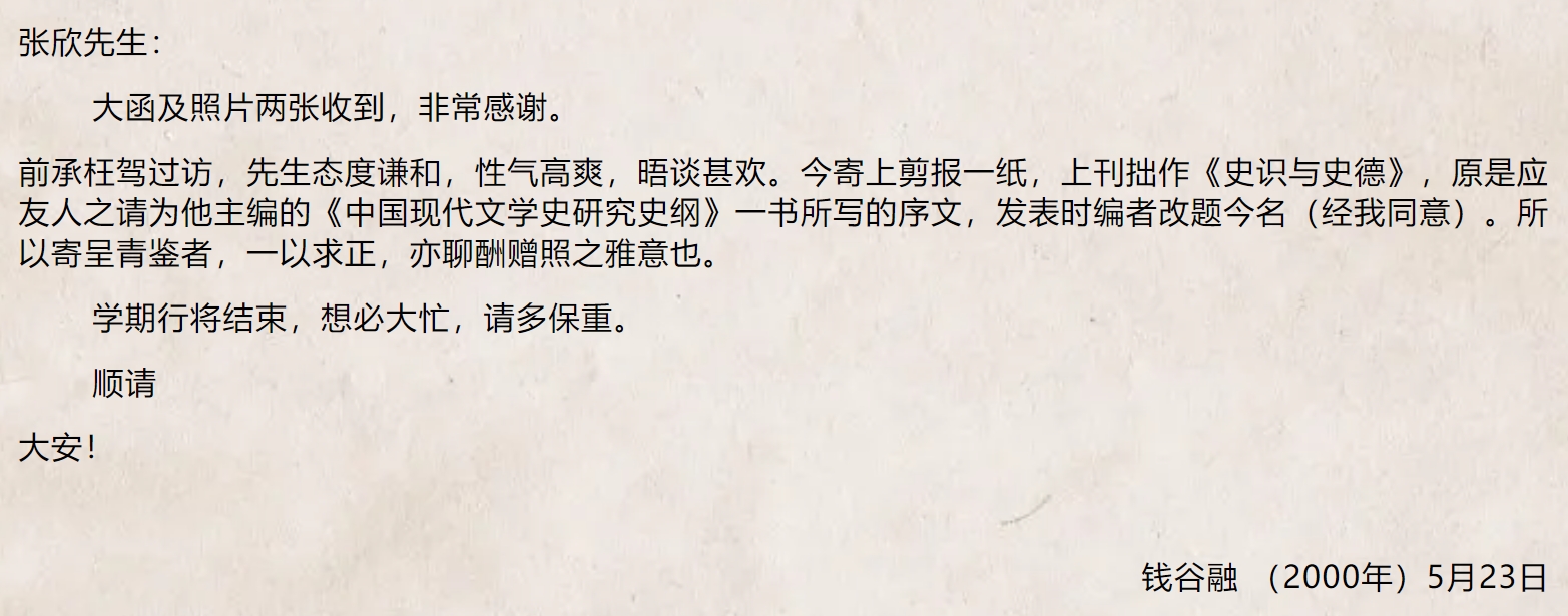 二〇〇〇年春天的拜訪,只是不足一個上午的時間。不過,我離開上?;氐綄W(xué)校之后的幾次通信,卻延續(xù)著我與錢先生的閑談。我將當(dāng)時拍攝的錢老照片和我們的合影寄去,隨即收到錢先生于當(dāng)年五月二十三日的回信,隨信另有一份剪報,是他為別人的書所寫序文的發(fā)表稿。信的末尾“聊酬贈照之雅意”一語,再次讓我感受到老一代學(xué)人為人處世的禮貌與周到??紤]到錢先生寫給我的信與明信片均未收入《閑齋書簡》或《閑齋書簡錄》,特予照錄如下,以備再版時酌收。