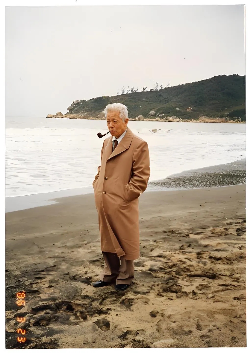 《畫傳》的封面用圖并非王瑤先生常見的經(jīng)典照。這張照片拍攝于1986年3月王先生受邀到澳門訪學(xué)時(shí)。此時(shí)的王先生已是滿頭銀發(fā),口銜煙斗,身穿棕黃色的翻領(lǐng)風(fēng)衣,在黑沙灘上踽踽獨(dú)行,神情若有所思。王先生身后,是陰沉的、灰色的海,連著同樣陰沉的、灰色的天。海浪迂緩,呈退潮之勢,露出棕黑色的沙灘。王先生佇立于一片泥濘的沙地上,沒有朝向大海,也沒有看向攝影者。他神情冷峻,眉頭微皺,似陷入孤獨(dú)的沉思中。不妨借用魯迅的無題詩——“心事浩茫連廣宇,于無聲處聽驚雷”來形容封面想要傳達(dá)的意境。選擇這張照片不僅是為了產(chǎn)生陌生化的效果,更想被讀作一個(gè)隱喻,一段包含省略號(hào)的、有待被書寫的“心史”,希望可以把讀者引入先生深邃的精神世界,從看似平靜的海面上想象他所經(jīng)歷的時(shí)代風(fēng)浪。