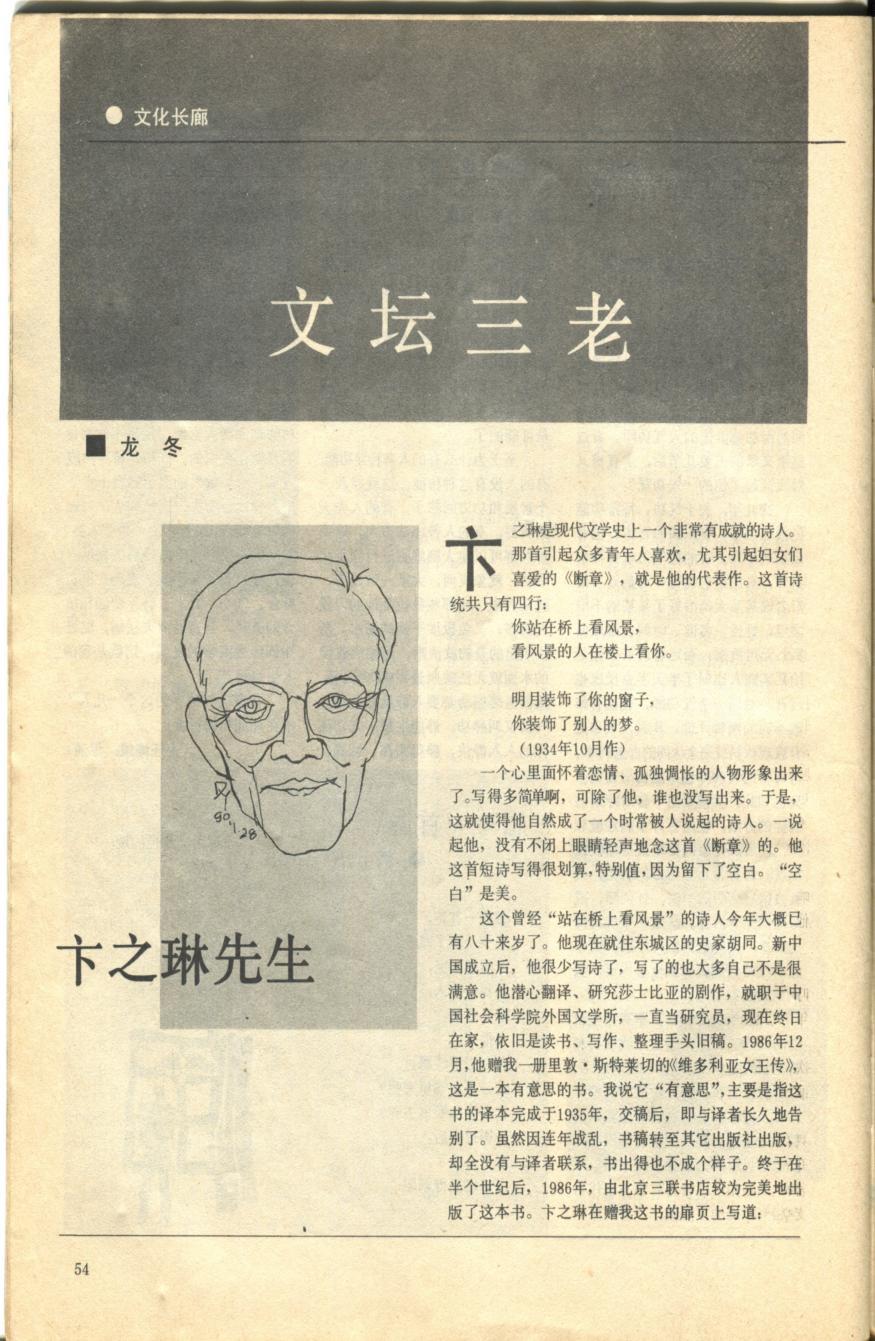 很抱歉,限于網(wǎng)絡(luò)等條件,我至今無(wú)緣看到《香港作家》刊載的《京華文壇三老》原文,不知道卞先生所言“惡俗不堪的污蔑語(yǔ)中有一句算改了”的具體情形。不過(guò),偶爾瀏覽“豆瓣”,發(fā)現(xiàn)有署名“龍冬”的網(wǎng)民發(fā)布于2019年2月25日、寫(xiě)于“1990年元旦”的舊作《卞之琳先生》(鏈接:https://www.douban.com/note/708159011/?_i=32978623aN1YHw),有這么一句話:
