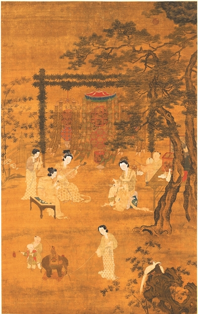 宋人李嵩的《觀燈圖》(臺北故宮博物院藏)描繪了婦孺兒童元宵夜宴飲、樂賞燈戲的場景。李嵩是宮廷畫家,山水、人物、花鳥樣樣在行。這幅《觀燈圖》的背景似是一富貴人家的后院花園之中,蒼松翠竹,芳草萋萋,曲橋護欄,花燈懸空,璀璨絢麗,嶙峋的怪石上立有一對五彩雉雞。居于畫面中央的是4位衣著典雅的仕女,左邊3位正在彈奏樂器,站立者正奏檀板,兩位坐著的仕女一位吹簫、一位橫彈琵琶。這種橫彈琵琶的方式,今天只在泉州南音中可以得見。右邊的仕女正在逗孩童,她身后還有兩位童子,手上各提一盞燈,其中一盞做成兔子的樣子,頗有童趣。旁邊的方桌上,擺著酒壺、碗碟,還有一盞走馬燈。