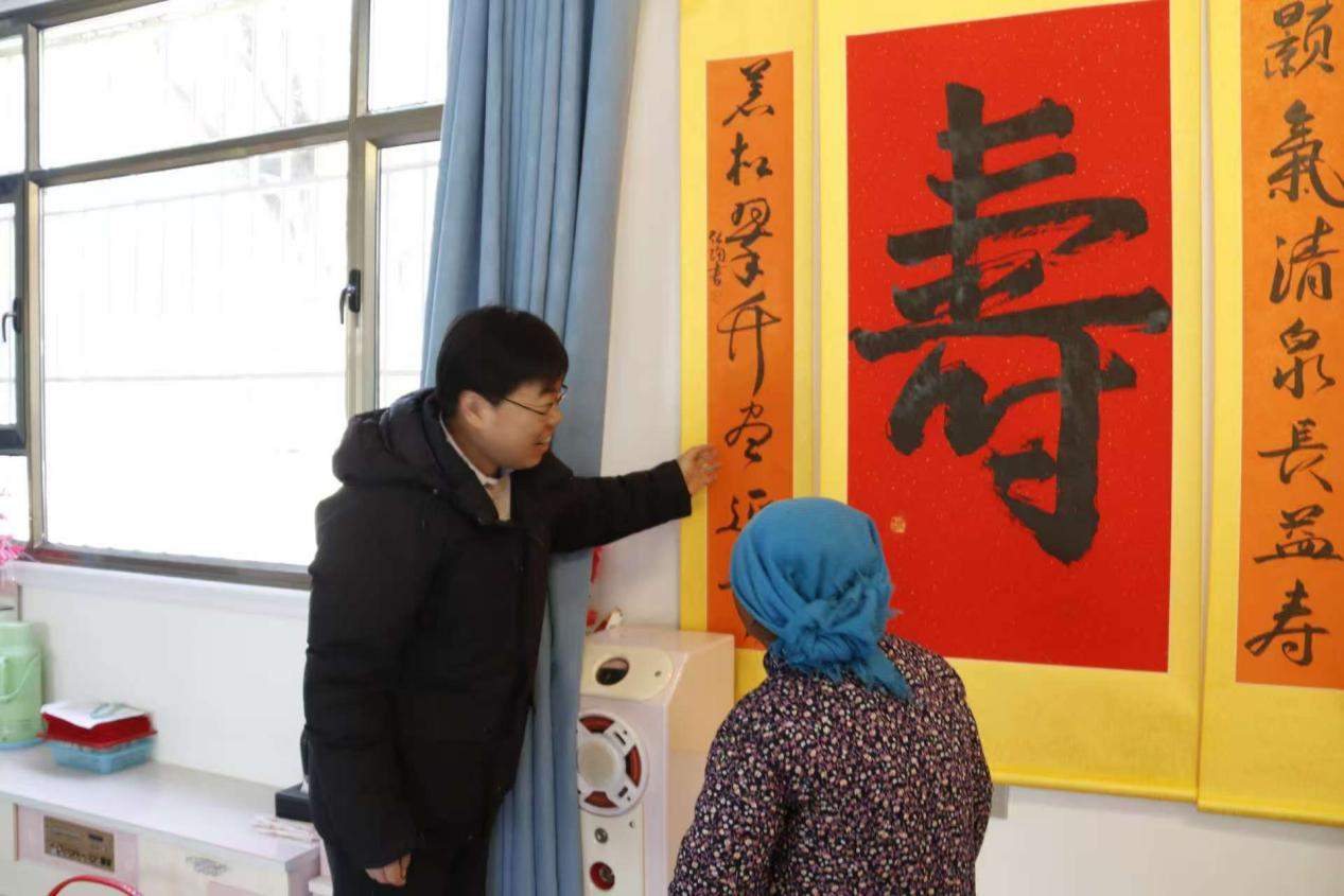 送春聯(lián)活動(dòng)結(jié)束后,池溝村黨支部組織走訪慰問村內(nèi)八十周歲以上老年人,為他們送去書法名家創(chuàng)作的中堂壽聯(lián)和米、油等生活用品。每到一戶,走訪人員都與老人傾心交談,陪他們嘮家常,關(guān)切詢問老人的日常生活、健康狀況,并和家人共同把中堂壽聯(lián)掛好,向老人介紹中堂壽聯(lián)創(chuàng)作及作者情況,轉(zhuǎn)達(dá)來自千里之外的祝福,為老人祝壽添福,以詩詞壽聯(lián)、中堂書法獨(dú)特的文化韻致,德化人心、滋養(yǎng)家風(fēng),傳揚(yáng)尊老敬老愛老的傳統(tǒng)美德。