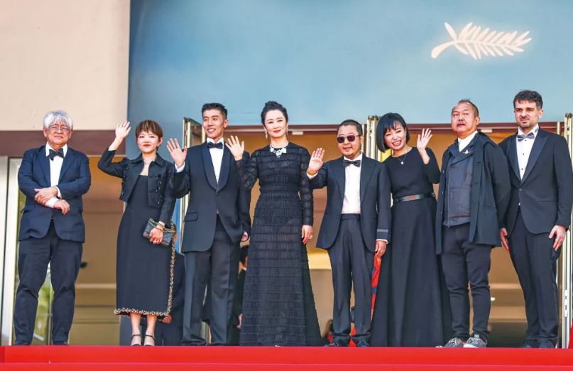 2024年5月18日,在法國南部小城戛納舉行的第七十七屆戛納國際電影節(jié)上,影片《風(fēng)流一代》導(dǎo)演賈樟柯(右四)攜主創(chuàng)出席首映禮。新華社記者高靜攝
