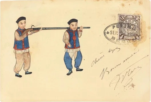 清二次片雙片之回片,周培春繪《抬槍射擊圖》,郵路:清代二次片雙片對(duì)折裁開(kāi)后使用。此片雖有書(shū)寫(xiě)收信地址,其實(shí)并未實(shí)寄。上有北京郵政局1901年9月6日之橢圓戳,為集郵性質(zhì)蓋銷(xiāo)
