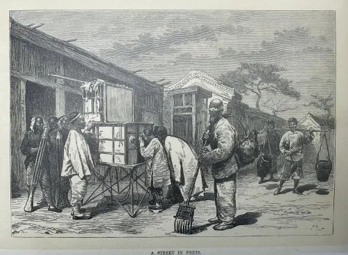 因此,那些帶有異國(guó)風(fēng)情的市井圖,便格外受到歡迎:頂缸、玩碗、修傘、當(dāng)鋪、夜巡、舞龍、逗貓、釘馬掌、西瓜攤、?;鹎颉⑹幥锴?、僧人化緣、童子樂(lè)隊(duì)、婦女吸煙、龜奴馭妓、鼓弦說(shuō)唱、冰床運(yùn)客、冬日堆雪獅子等等,三教九流,五花八門(mén),煙火氣十足,仿佛是“晚清上河圖”的“蒙太奇”。在一組二十枚民俗套片中,還赫然寫(xiě)上“中國(guó)人玩碗”“中國(guó)人看洋片”“中國(guó)人玩戲法”“中國(guó)人踢毽子”“中國(guó)瞎子”的書(shū)法。對(duì)畫(huà)者來(lái)說(shuō),這些現(xiàn)象司空見(jiàn)慣,用不了多此一舉,所以以“中國(guó)人”為前綴,等于為奇異事物注解,簡(jiǎn)單粗暴的背后,正是殖民主義者的觀看欲望,實(shí)在忍不住大驚小怪。