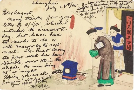 所以說(shuō),所有“合作”帶來(lái)的光暈,才是手繪明信片鮮活的靈魂。其中,文字與圖畫(huà)的互不設(shè)防,恰好等同于東方與西方的互不相認(rèn),正解也好,誤讀也罷,看起來(lái)都是生機(jī)。僅以幾件出自上海地區(qū)的明信片為例,“捕黑熊圖”屬于極簡(jiǎn)式,只在囚熊的木枷上添上“1906”字樣,立馬產(chǎn)生一種“非現(xiàn)實(shí)”的寓意,是不是針對(duì)時(shí)局的惡意也未可知。相反的情緒,是一件“龜奴馭女圖”帶來(lái)的愉悅,本是滬上四馬路常見(jiàn)的風(fēng)塵,頭頂上卻飄來(lái)“新年快樂(lè)”的手寫(xiě)花體字,也不知這個(gè)德國(guó)人是否了解風(fēng)化,便借此來(lái)向遠(yuǎn)方的親人道賀。類(lèi)似因誤解而產(chǎn)生喜感的例子,在手繪明信片中俯拾皆是。在一件清朝官員為了祭祀燒紙轎的明信片上,這位叫威爾的英國(guó)人告訴他的朋友,“這個(gè)紳士從天堂的大門(mén)里走出,帶給世界各地人們以好運(yùn)”,真是好笑。其實(shí)呢,選擇這枚明信片的真實(shí)動(dòng)機(jī),猜想是看中了畫(huà)面上燃燒的火焰,因?yàn)閷?xiě)信人覺(jué)得,“過(guò)去一周的高溫非??膳拢陉帥鎏幊^(guò)華氏一百度,夜間最低溫度為八十五度”,當(dāng)然啦,同時(shí)也表達(dá)“我會(huì)一直愛(ài)著你”的熱情。