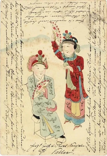 手繪明信片誕生在這個(gè)“機(jī)械復(fù)制”為時(shí)髦的時(shí)代,顯然是不合時(shí)宜的。實(shí)用品以人工繪制,耗時(shí)又費(fèi)力,但附著于郵政明信片,反倒是舊瓶裝新酒,是一種深入淺出的新玩意兒,在對(duì)東方抱有獵奇心態(tài)的使用者,也就是那些來(lái)華洋人看來(lái),明信片不費(fèi)巨資,卻難得手工定制,不僅別出心裁,品位還不凡,值得向遠(yuǎn)方的親人炫耀。