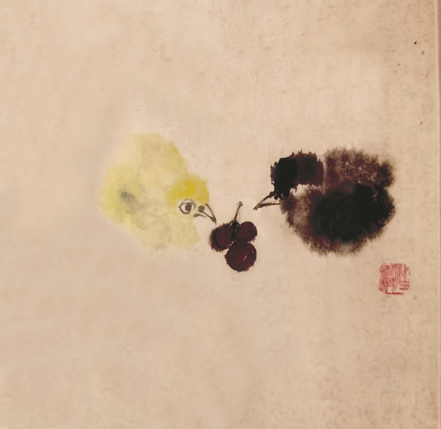 那是宗璞先生第一次向汪曾祺先生討畫:“不想一周內(nèi)便來了一幅斗方。兩只小雞,毛茸茸的,歪著頭看一串紫紅色的果子,很可愛。果子似乎很酸,所以小雞在琢磨罷?!保ā度鶊D》)隨后,汪曾祺先生又給宗璞先生畫了一幅牡丹圖并題詩:“人間存一角,聊放側(cè)枝花,臨風(fēng)亦自得,不共赤城霞?!贝送?,還有一幅水仙圖和一幅寫意荷花圖。