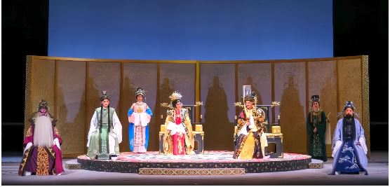 全劇一波未平一波又起,用幾個層疊交織的高潮展示了武則天黜子上位的血色路徑。這些高潮既構(gòu)成情節(jié)內(nèi)容和戲劇沖突的跌宕起伏,又是人物內(nèi)心感情的洶涌激蕩。病榻前,高宗李治與武后試探性的對白和唱腔,形成了她邁向?qū)氉牡谝淮巍翱鐧凇?。被流放巴州的李賢給守喪的母后親手烹飪蒸餅慰問,已經(jīng)反目的母子雙方,在權(quán)力與親情試探性的對白和唱腔中,走向決裂,形成第二次高潮。第三個高潮,是李顯繼位之后,武后特意安排上演參軍戲,借參軍之口,揭露李顯另有所圖。接著武后細述管理國家之難,指責(zé)李顯無能,難以擔(dān)起中興大唐的重任。第四個高潮,最后她佯將皇位交給李旦時,已被幾位兄長的下場嚇破了膽的李旦,跪地堅持不受,女皇上位。