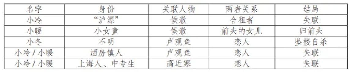 《嚼鐵屑》有一個引人注目或說令人恍惚的現(xiàn)象,就是幾個女孩都叫小冷或意思相近的小冬。小冷們或被戀人私下喚作小暖,或自己改名為小暖,而那個本來叫小暖的小女孩表面柔弱其實陰郁。很顯然,這是甫躍輝的有意為之。如此一來,能指和所指的對應關系被打亂,確定性被不確定性所取替。由于小冷們涉及的人物和關系各有不同,略作整理如下: