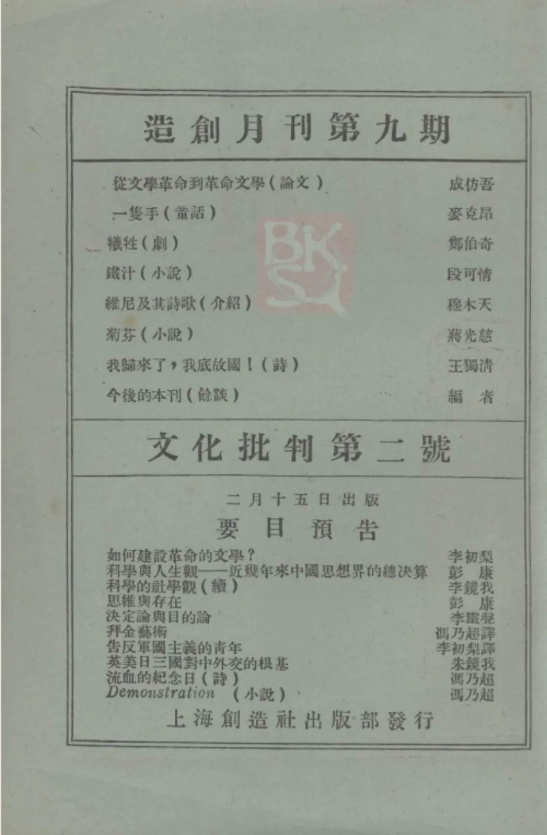 [20] 參見《文化批判》第1期廣告頁(yè),1928年1月15日。