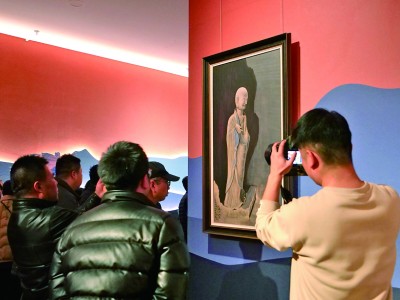 臨摹自麥積山石窟第133窟微笑小沙彌的壁畫(huà)備受觀眾關(guān)注。記者 尚杰攝/光明圖片