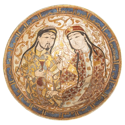 米納伊彩人物花卉銘文釉陶碗為核心展品之一。它產(chǎn)于公元12—13世紀(jì),內(nèi)壁中央繪有一對戀人,這是古代伊朗常見的藝術(shù)插圖題材。這對戀人的形象具有明顯的東亞人特征,男子手中握著一個精致的酒杯,似乎在向他的愛人敬酒。人物周圍環(huán)繞著平行和扭曲的阿拉伯式花紋,碗口在一圈鈷藍(lán)底上飾有金色庫法體文字。