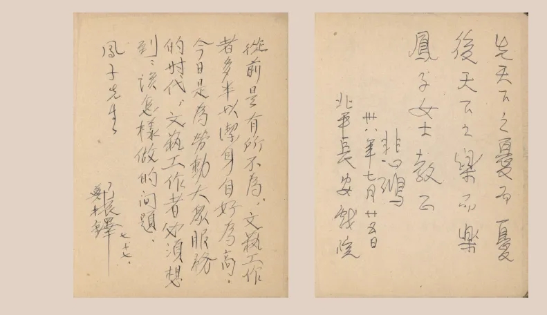 周恩來留言“為建設(shè)人民藝術(shù)而努力!鳳子姊,周恩來。七.十六?!绷攘葦?shù)語,卻飽含著他對(duì)文藝家的親切關(guān)懷和對(duì)文藝事業(yè)的殷切期望。
