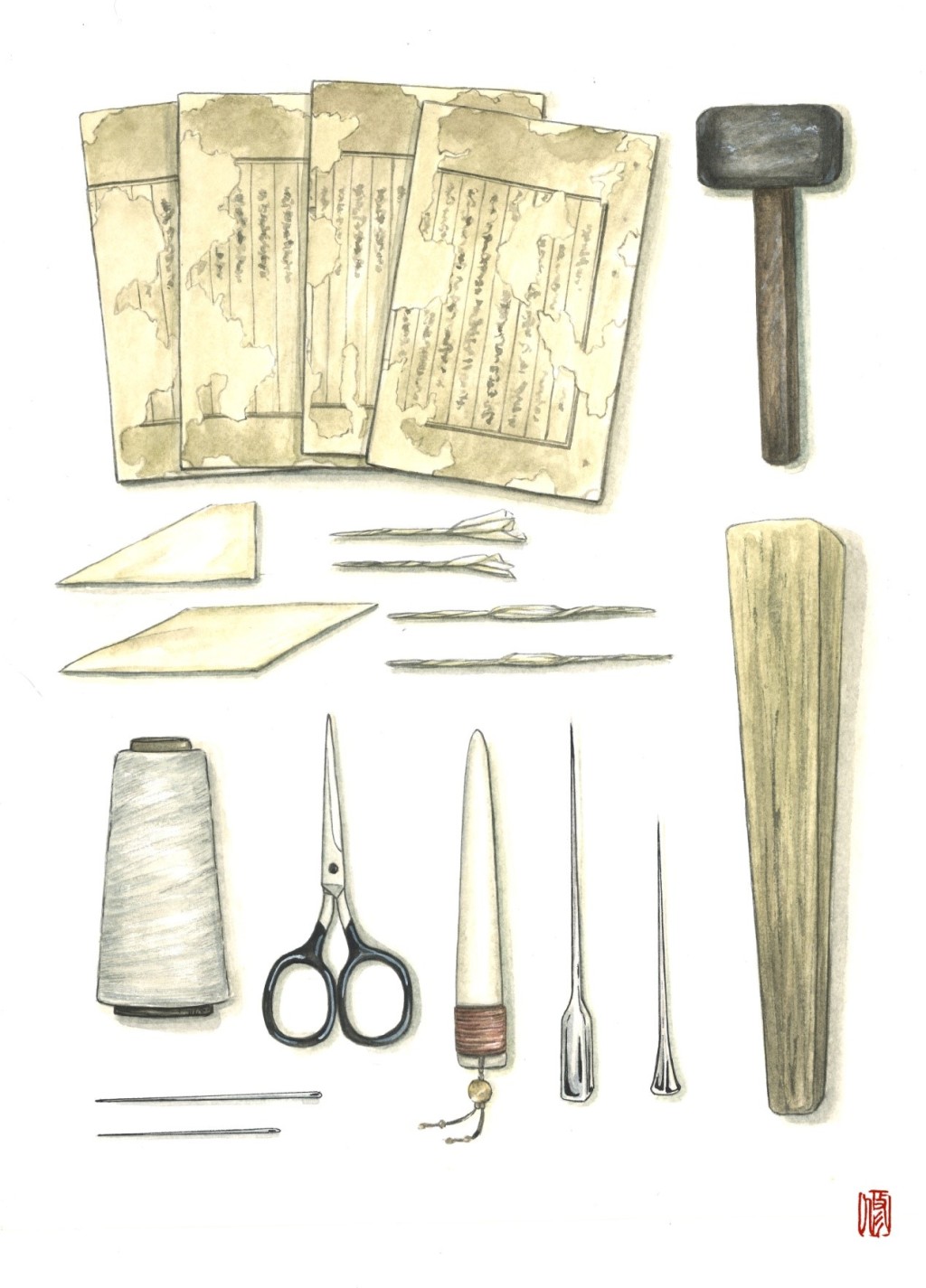 那段時間,常翻看以前的修復(fù)檔案,回憶之余,憑借一點藝術(shù)生的功底,嘗試用水彩描繪修書工作,慰藉自己的想念之情,這便是我畫古籍修復(fù)的緣起。