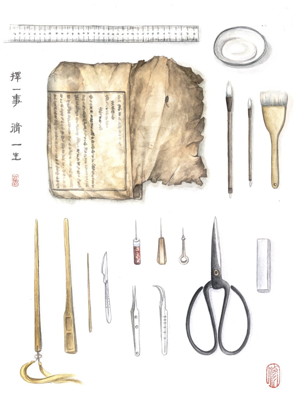 修書的技法由一整套工序組成,除補書頁之外還有洗書、裝訂等繁簡不一的步驟,我擔(dān)心自己把修書體驗一不小心寫成操作手冊,故而根據(jù)文獻背后的歷史穿插講述了一些文化典故,以求增加可讀性。書中大量插圖是我親手繪制的,繪畫的過程就像是把喜歡的事物在心里又強調(diào)了一遍,從而讓這份喜愛變得更加堅定,也讓文字看起來不那么乏味。不過修書匠的水平有限,書中內(nèi)容尚有不足。不久前,向南京大學(xué)古籍修復(fù)專家邱曉剛老師請教,才知道因南方潮濕多雨,糨糊在調(diào)制、保存方面和干燥寒冷的北方有些許區(qū)別,長居北方的我雖修書十余年,專業(yè)方面仍有孤陋寡聞之處,手藝這一行當(dāng)永遠學(xué)無止境。寫作此書,僅為傳達古籍修復(fù)的常識性知識,展示一點古籍修復(fù)工作的真實情況,解答大眾普遍問題,望借此引起讀者朋友們對于中華古籍文獻保護的關(guān)注和興趣。