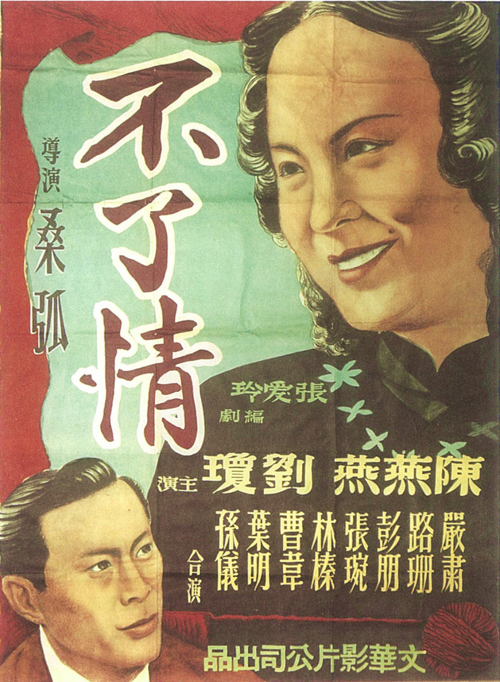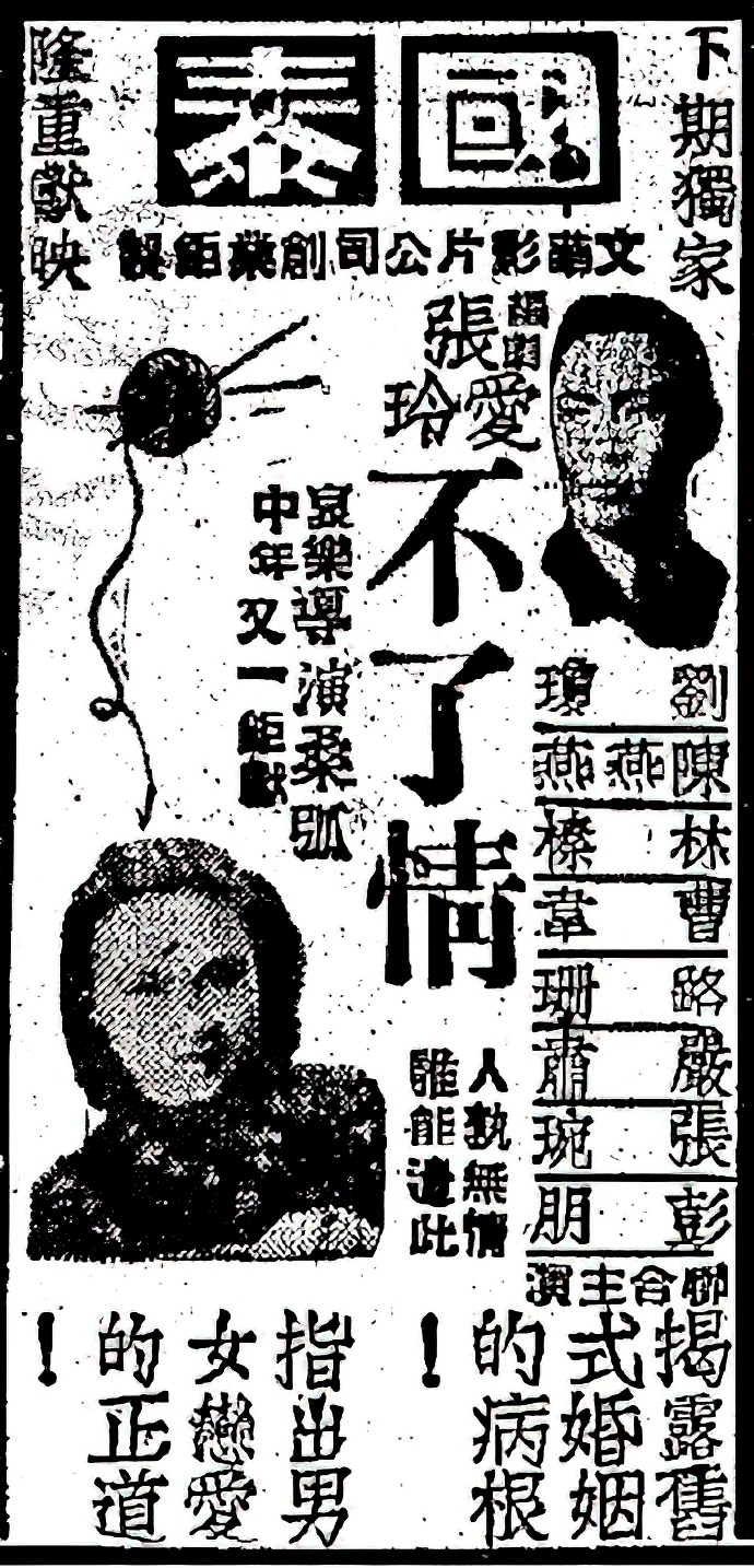 緊接著,情感的拉絲更細更密也更長的《不了情》在國泰戲院登場。電影海報上有對“健康的主題”宣告:“揭露舊式婚姻的病根!指出男女戀愛的正道!”(電影《不了情》廣告,香港《大公報》1951年5月21日);也有以導(dǎo)演之名趁熱打鐵的召集:“《哀樂中年》導(dǎo)演?;∮忠痪瞢I”“本院連滿一百一十場之《哀樂中年》大導(dǎo)演”(電影《不了情》廣告,香港《大公報》1951年5月24日);不過,比導(dǎo)演名更居視覺中心、字體也更大的是編劇“張愛玲”。此時的張愛玲,還在解放后的上海:她以筆名“梁京”在《亦報》上連載了長篇小說《十八春》,?;∑诖@是她“創(chuàng)作生活上的再出發(fā)”(叔紅[?;:《推薦梁京的小說》,上?!兑鄨蟆?950年3月24日),她也以這個筆名為?;?dǎo)演的新片《太平春》寫了影評;她還在夏衍的關(guān)注下,參加了“上海市第一屆文學(xué)藝術(shù)工作者代表大會”。因為《不了情》,她的名字出現(xiàn)在香港海報和報紙上的時候,《十八春》已在報上連載完,她可能為單行本的出版忙著修訂,也可能已經(jīng)在著手寫中篇小說《小艾》,幾個月后它又將在《亦報》上連載。