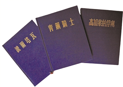 我在巴金故居和中國(guó)現(xiàn)代文學(xué)館曾見過(guò)查良錚在平明出版社出版的五種譯著,它們是珍貴的特裝本、題簽本。巴金故居藏的是四種普希金的作品:《波爾塔瓦》《青銅騎士》《高加索俘虜》和《普希金抒情詩(shī)集》,都是方形的28開本。前三種是藍(lán)色綢布封面,燙金的書名,每種扉頁(yè)上都有題簽,是查良錚雋秀的字體:“給蘊(yùn)珍,良錚?!保ㄊ捝罕久愄N(yùn)珍)另外一種《普希金抒情詩(shī)集》封面則更為精美,顯示了那個(gè)時(shí)代印制水平的高度。它是有暗花的藍(lán)布,下端,燙銀的書名,而封面的主體部分,則是壓印的主題圖案,整個(gè)封面簡(jiǎn)潔又豐富。中國(guó)現(xiàn)代文學(xué)館所藏的《歐根·奧涅金》,是題贈(zèng)給巴金先生的,這本書用的是大紅底金絲線繡花的緞面做書封,張揚(yáng)恣肆,又精美絕倫,讓人大開眼界。