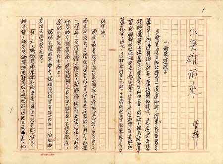歷經(jīng)半個世紀,《小英雄雨來》手稿整體保存很好,作者管樺用藍黑墨水在“25×20=500”的紅色豎排格紙上創(chuàng)作,修改處并不多,共57頁、21章。從最后一頁可知,該稿并不完整。家屬介紹,這部手稿是管樺在新中國成立后創(chuàng)作的,但這是第幾稿他們也并不很清楚。