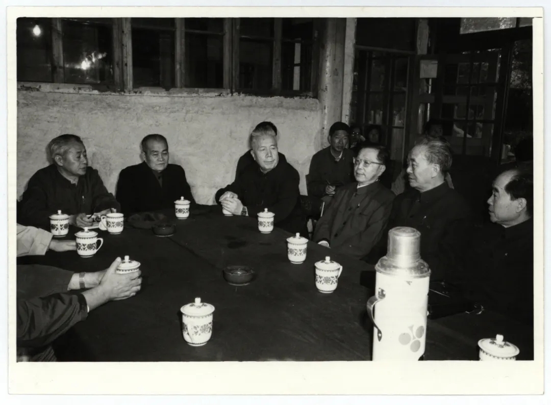 中國(guó)現(xiàn)代文學(xué)館籌建處成立照片,與會(huì)者討論中國(guó)現(xiàn)代文學(xué)館的籌辦事項(xiàng),圍桌者右起:孔羅蓀、艾青、曹禺、周揚(yáng)、胡喬木、朱子奇、賀敬之。