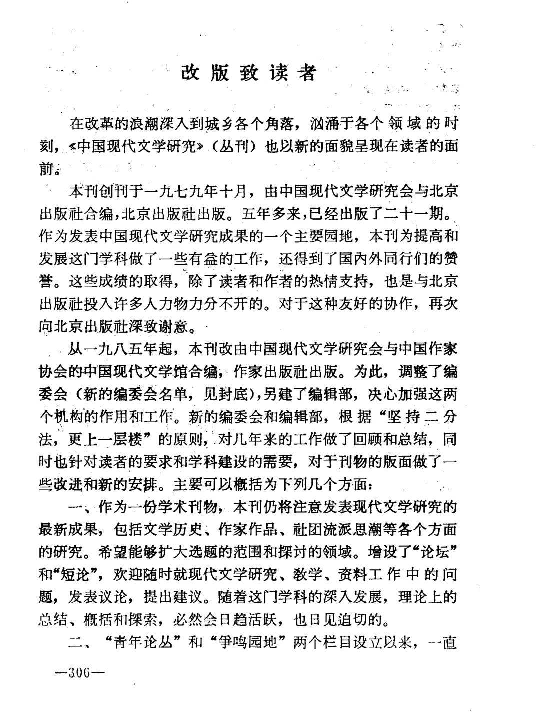 《中國(guó)現(xiàn)代文學(xué)研究叢刊》1985年第1期封面及改版致讀者頁(yè)