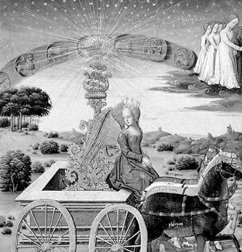 到了文藝復(fù)興時(shí)期,對天空的描繪和對星座的癡迷在藝術(shù)家群體中更為盛行。被稱為“人文主義之父”的彼特拉克是意大利詩人和人文主義學(xué)者,很少有人關(guān)注的是,他同時(shí)還是一位技法卓絕的畫家,在寓意體長詩《凱旋》中他就加入了自己的畫作。在一幅名為《時(shí)間的凱旋》的插圖中,太陽在滿天繁星中運(yùn)行,橫跨天空的黃道帶上繪制著十二星座的對應(yīng)圖符,這是一個(gè)并不符合實(shí)際情況的想象性描繪,表達(dá)了人類的輝煌與天空中眾星的狂歡。